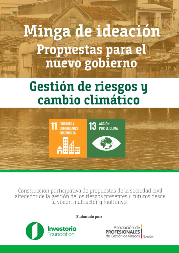 Fundación Investoria y la Asociación de Profesionales de Gestión de Riesgos del Ecuador (APGRE), en colaboración con representantes de la sociedad civil, jóvenes, gobiernos locales y academia, se han elaborado un conjunto de acciones prioritarias alrededor de la Gestión de Riesgos y cambio climático que exhortamos al siguiente gobierno a incluir dentro de su política y planificación.